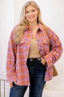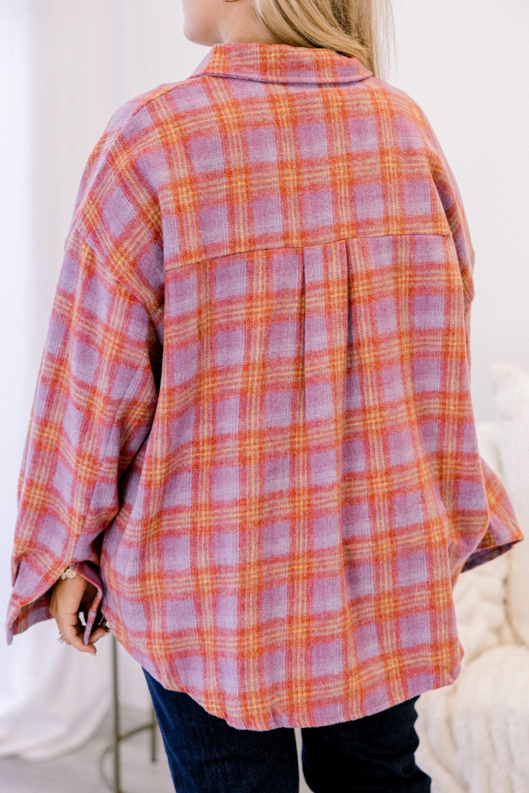 Stay trendy and playful with this jacket! Featuring a purple and orange plaid design, this button up jacket is perfect for adding a pop of color to any outfit! The collar detail, two chest pockets, and pockets on the side offer both style and function, while the cuff sleeves add a touch of quirkiness!