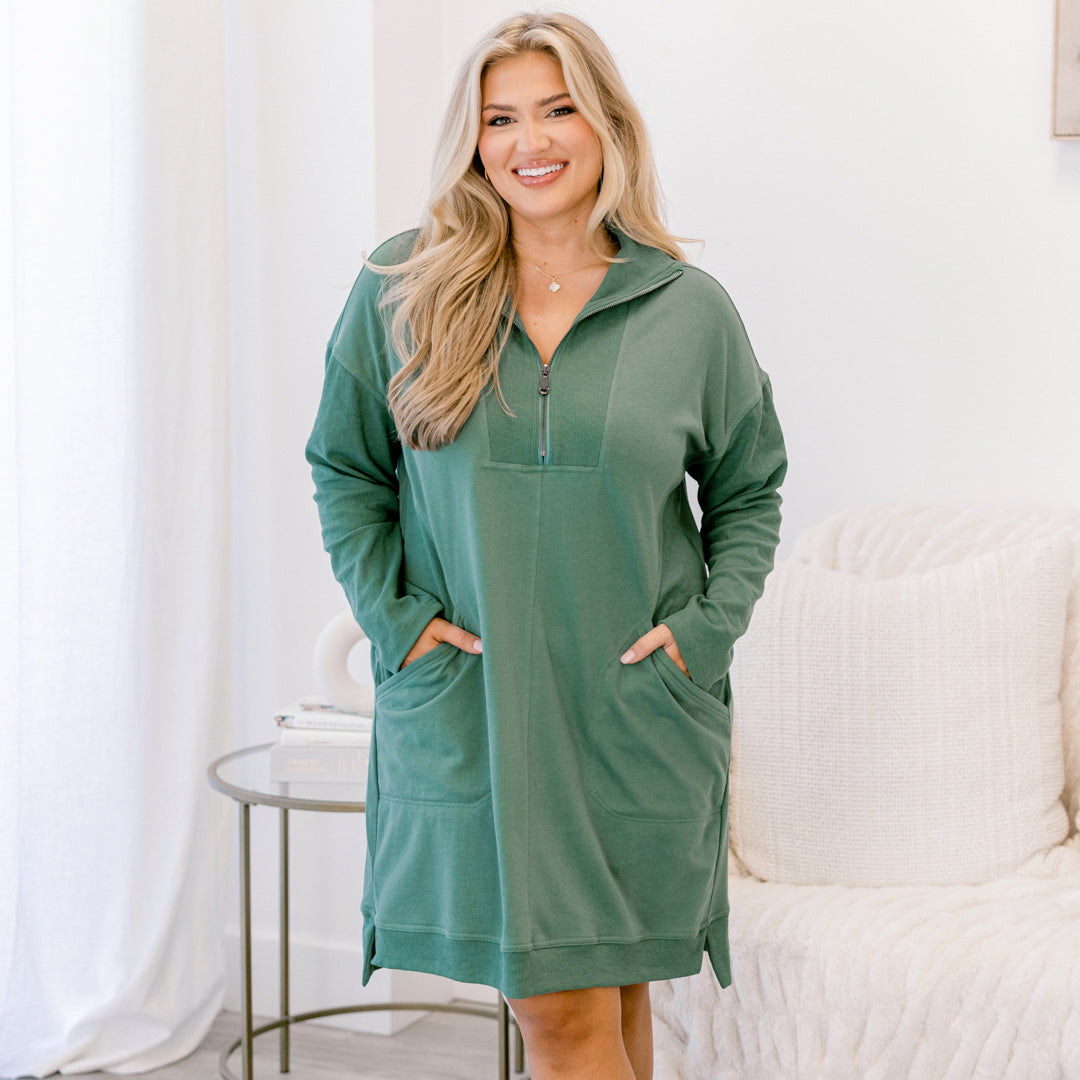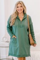 Rock the perfect balance of comfort and style in this dress! This dusty teal sweatshirt dress features a collared quarter zip neckline and convenient pockets, making it the ultimate combination of functionality and fashion! With its high low hemline, you’ll be sure to turn heads wherever you go!